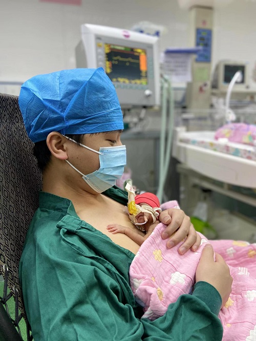 作品:“袋鼠爸爸”的温暖;作者:吴煌艺;单位:福建医科大学附属第二医院;作品简介:福建医科大学附属第二医院NICU的28周早产儿因缺乏安全感哭闹不安,管床医生郭挺为宝宝在床边进行袋鼠式护理,安抚患儿安静入睡。
