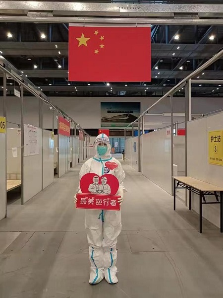 作品:我以我心爱祖国,我以我行报祖国;作者:危艳萍;单位:福建省立医院;作品简介:2021月10月1日,在莆田抗疫定点医院10病区,抗疫“天使”们在防护服贴上“何其有幸,生于华夏”、“如果信念有颜色,那一定是中国红”、“我以我心爱祖国,我以我行报祖国”等文字,表达自己对祖国母亲的爱。