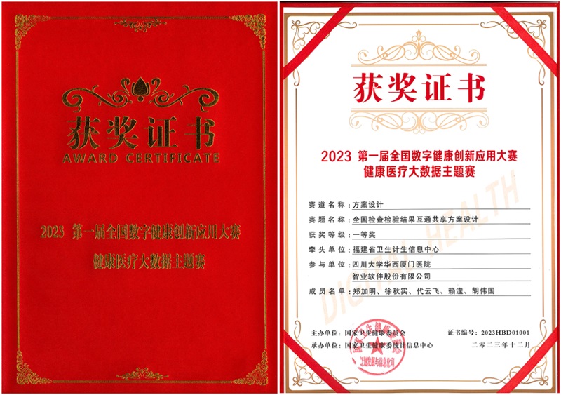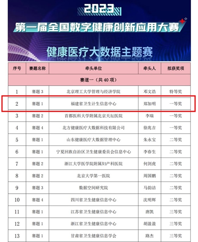 日前,由国家卫生健康委员会主办的第一届全国数字健康创新应用大赛健康医疗大数据主题赛在北京圆满落幕。本次大赛聚焦健康医疗数据共享开放应用,由方案设计、算法模型、应用创新三个赛道组成,吸引来自全国近800支队伍、3200人报名参加。经过初赛、决赛的激烈角逐,由福建省卫生计生信息中心牵头,联合四川大学华西厦门医院等单位共同设计的《全国检查检验结果互通共享方案》荣获一等奖。