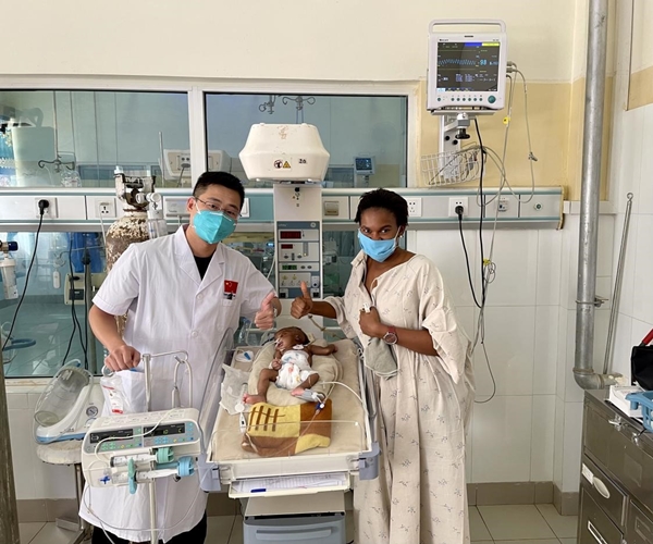 他还记得2023年7月,在塞内加尔迪亚姆尼亚久儿童医院(援塞医疗队工作所在医院)为一名非洲低体重儿提供周详的麻醉方案,成功助力开胸手术治疗的经历,不仅体现了中国医生对非洲患者的关爱,也展示了中国医疗援外工作的力量。这名患儿是一名体重仅1.5公斤的早产儿,出生时呼吸困难,进食即呕吐。经过检查,发现胃管无法到达胃部,结合症状表现,诊断为“先天性食管闭锁”,这是一种非洲较为常见的先天性畸形,但是为这一低体重儿开胸手术提供一个完美的麻醉方案却极具挑战性,需要综合考虑多方面因素。最终,黄建斌选择了气管插管通气下全身麻醉的方案。由于患儿哭泣无声,口腔分泌物多,可能合并先天性气道畸形,部分患者可能合并心脏大血管畸形,但当地医疗条件限制,无法进一步检查确认,只能靠个人专业理论和丰富经验开展工作。经过不断努力,最终黄建斌为患儿成功实施了麻醉,整个手术过程历时约90分钟。第二天,随访患儿生命征稳定,恢复良好。援塞期间,黄建斌利用麻醉可视喉镜多次解决这类气道堵塞难题,并将该技术手把手教会当地医生,填补了当地医院的一项技术空白。
