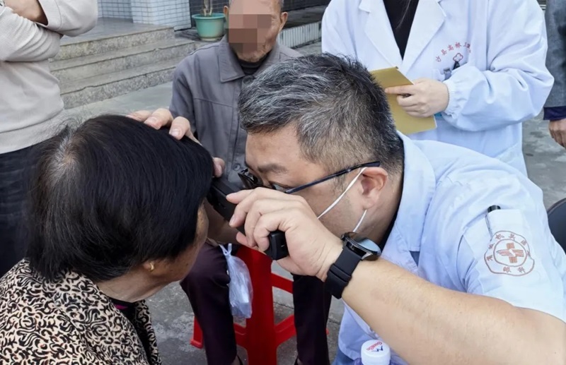 福建省级机关医院眼科副主任医师、福建省健康科普专家、福建卫生报健康大使林泰南自带裂隙灯和眼底镜等眼科检查工具,一到义诊桌前,就开始熟练地为群众开展检查。“我来赶集,看到有义诊,听说还有专家,就赶紧过来了。”68岁的张奶奶,眼睛模糊很多年,一直没有去医院做检查。林泰南用眼底镜检查后判断,张奶奶左眼有白内障,且达到了手术条件,建议去医院进一步治疗。