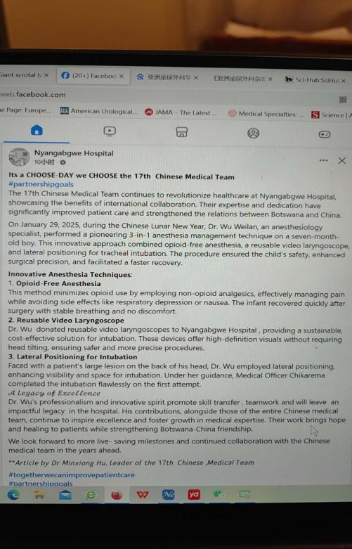 麻醉科主治医师吴蔚蓝将去阿片化麻醉、新型可视喉镜和侧卧位插管三种技术创新整合,在仰加圭转诊医院成功为一名7个月的男婴实施手术麻醉。该技术不仅能避免阿片类药物带来的呼吸抑制、恶心呕吐等副作用,也消除了传统仰卧位插管可能造成局部损伤的风险,为手术的顺利进行以及患儿的术后康复提供了坚实保障,得到仰佳圭转诊医院社交媒体“脸书”(Facebook)账号的转发与点赞。